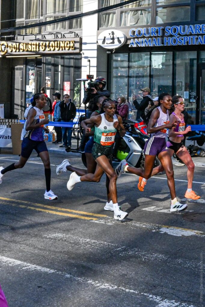 A new course record was set today. Hellen Obiri, a three-time Olympic medalist, overtook 2022 champion Sharon Lokedi in the final mile and finished in 2:19:51. All three medalists were from Kenya, and all three ran faster than the previous record set in 2003 (2:22:31):