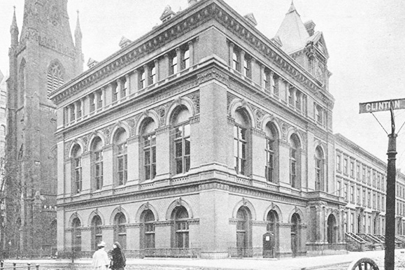 The Center’s headquarters stands at the corner of Pierrepont and Clinton Streets. It was built between 1878 and 1881, designed by architect George B. Post, who won a competition among 14 contestants. The building is constructed in the Neo-Renaissance style, featuring terracotta decorations by the Perth Amboy Terra Cotta Company and sculptures by Olin Levi Warner, including busts of Michelangelo, Beethoven, Gutenberg, Shakespeare, Columbus, Benjamin Franklin, as well as figures of a Viking and a Native American.