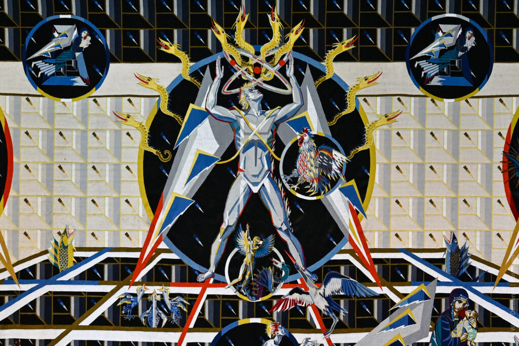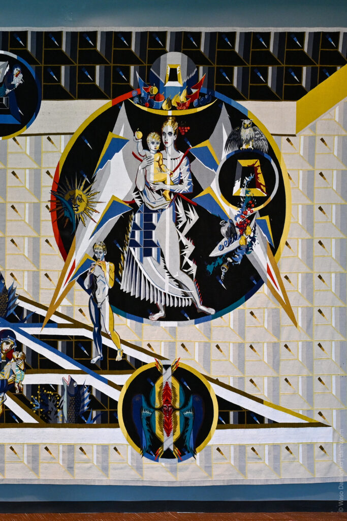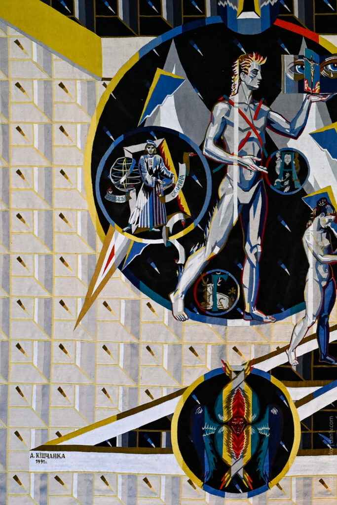 Interestingly, the tapestry does not depict the tragedy directly: you won’t find a reactor or liquidators on it. Instead, it uses a symbolic language characteristic of icon-painting traditions. The composition is triptych-like, similar to a folding icon, representing the past, present, and future.