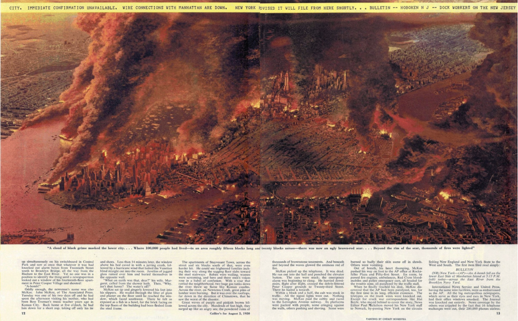 Without a doubt, it was one of the most terrifying images ever to appear on the cover of a major American magazine. Opening the spread, readers were confronted with a city in flames. Across the interior illustrations ran a news-ticker headline: “…WIRE COMMUNICATION WITH MANHATTAN ARE DOWN…”