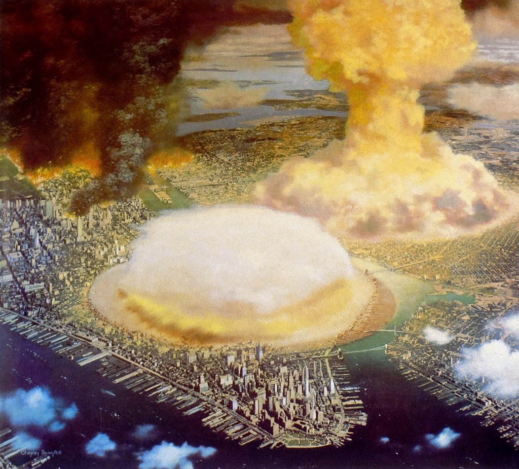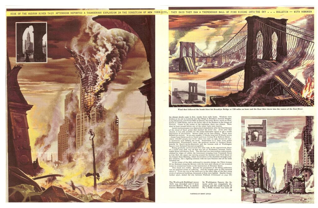 It turns out that in 1950, the popular magazine Collier’s published a detailed account of what an atomic bomb would do to New York — in horrifying detail — complete with illustrations by Chesley Bonestell (1888–1986).