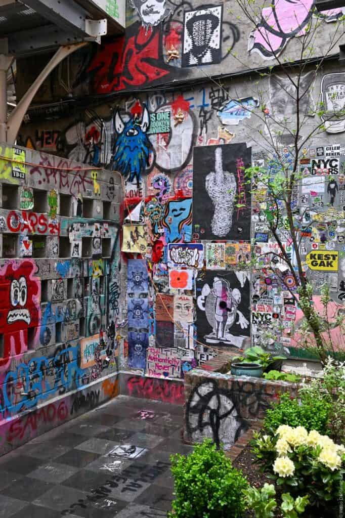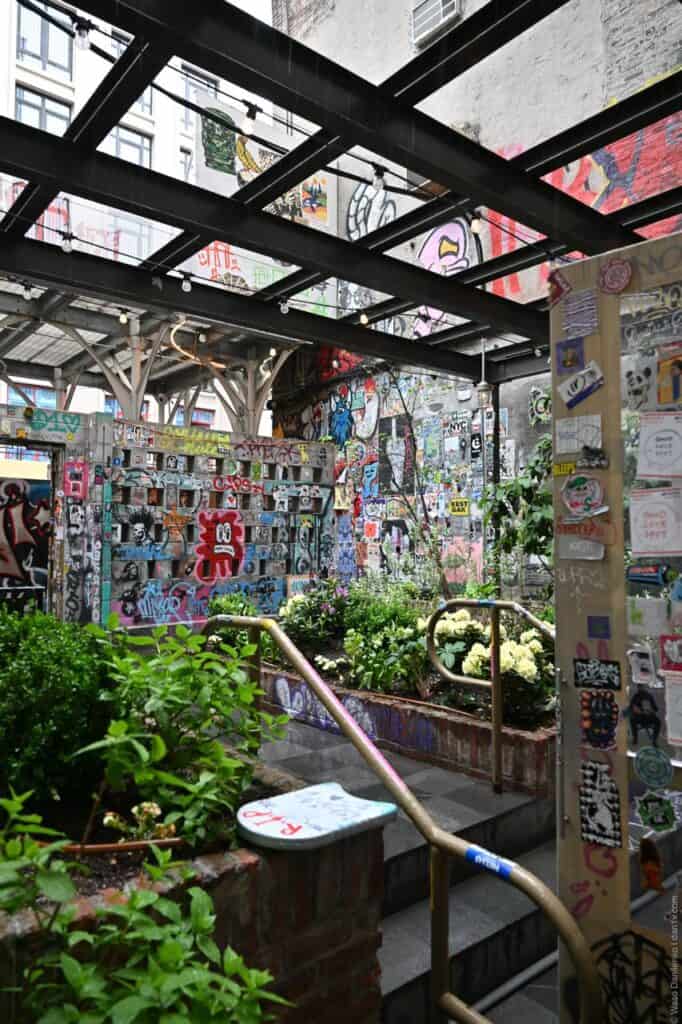 Fun fact: Despite not being a particularly deep alley, Freeman Alley is deeply connected to New York’s history, with different eras layered onto this tiny space, just like the graffiti and stickers that overlap on its walls.