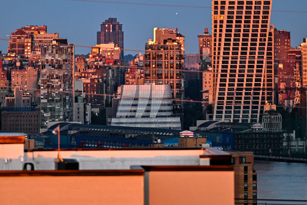 The main feature of Gehry’s building, aside from the signature absence of right angles, is its milky facade, which changes tone depending on the weather. On a cloudy morning it looks like a massive iceberg on the Hudson’s edge; in the evening, like a screen that diffuses the sunset.