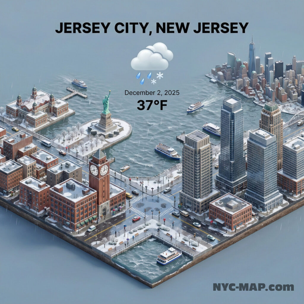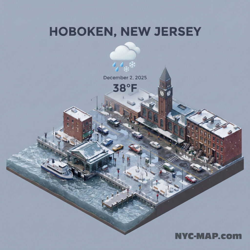 A lively New Jersey city with a walkable waterfront, brownstones, and views of the Manhattan skyline.