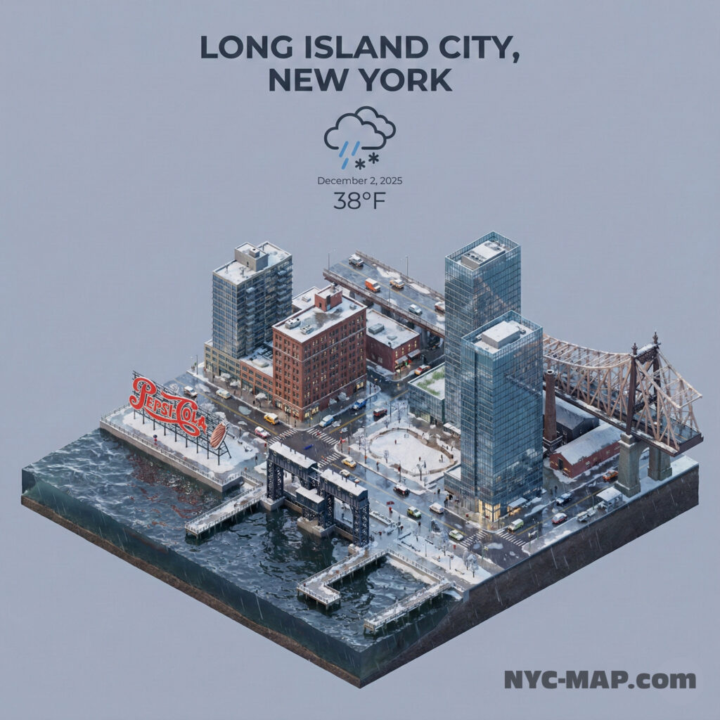 A modern Queens neighborhood featuring high-rises, cultural spaces, and a waterfront promenade.