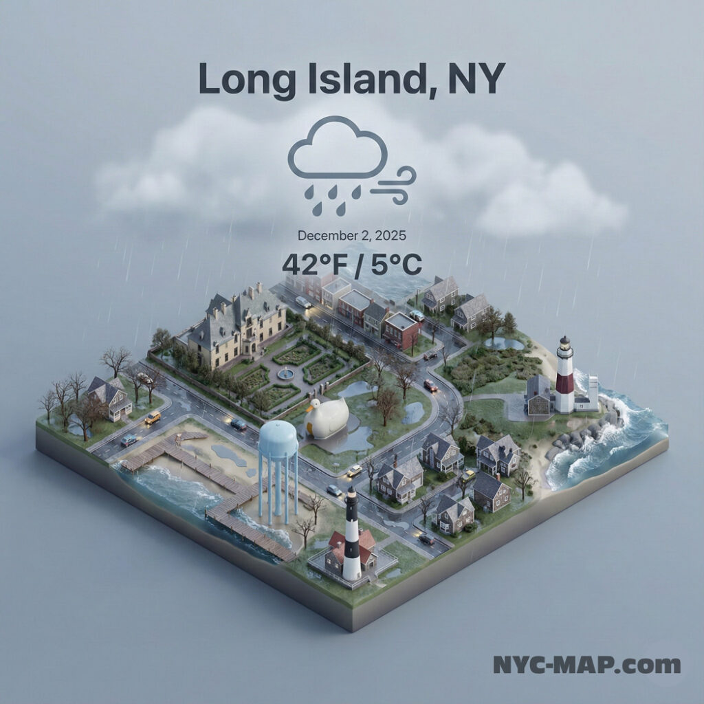 A large suburban region east of New York City featuring beaches, towns, and sprawling residential areas.