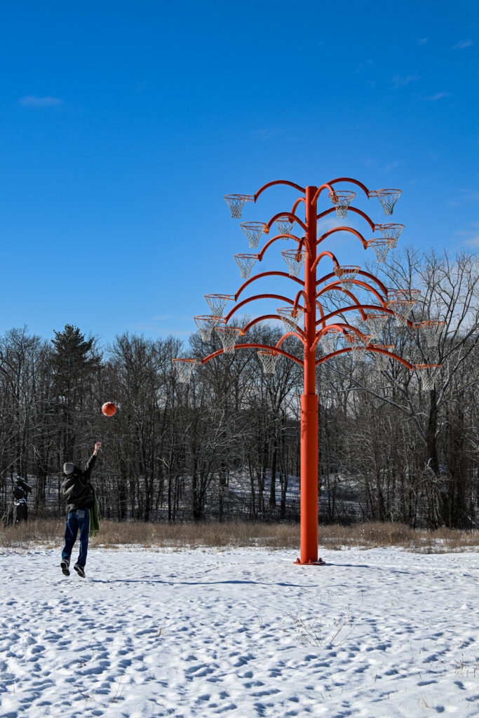 You might throw a ball into a tree made of basketball hoops, walk through a maze, step through a door that leads nowhere, or climb an elaborate staircase attached to a sort-of-building.