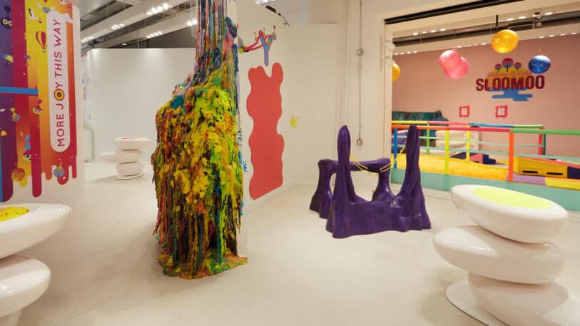 It simultaneously evokes the interior of an expensive Soho boutique and a child’s fantasy. The area has a historical connection with gallery art, pop art spaces, and unconventional commercial projects. Sloomoo fits perfectly here.