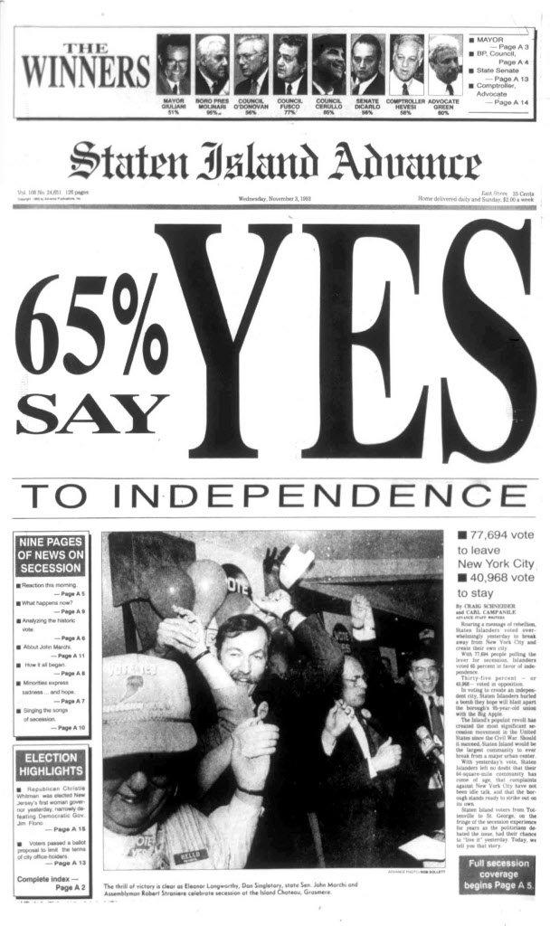 In 1993, under pressure from local politicians and activists, Staten Island held an official referendum on seceding from New York City. The results were surprisingly decisive: