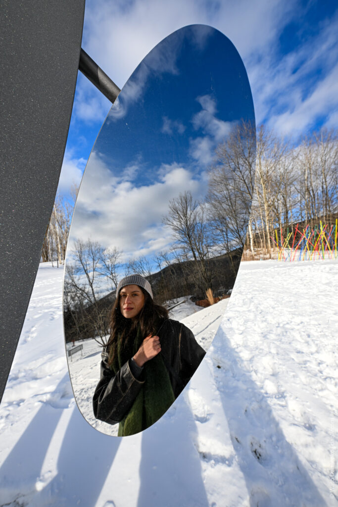 The most Instagram-friendly work is a kinetic sculpture by Vadim Kosmachev, assembled from mirrored panels mounted in rigid metal frames. The panels rotate, reflecting light, sky, and the surrounding landscape.